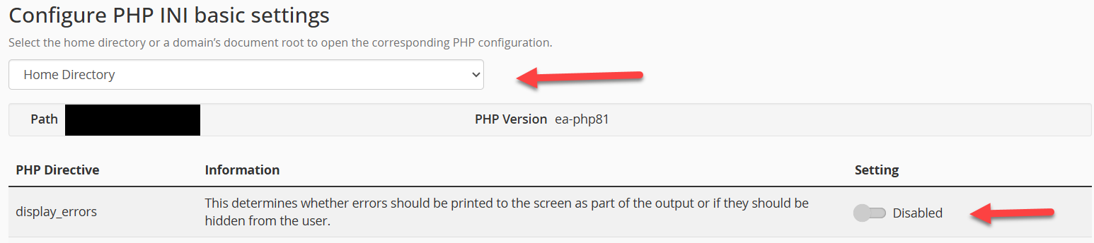 2 - Acesse o "Basic Mode" no editor de configurações PHP. Em seguida, selecione o domínio desejado e localize a opção display_errors. Ative esta opção para permitir que mensagens de erro do PHP sejam exibidas diretamente no navegador.